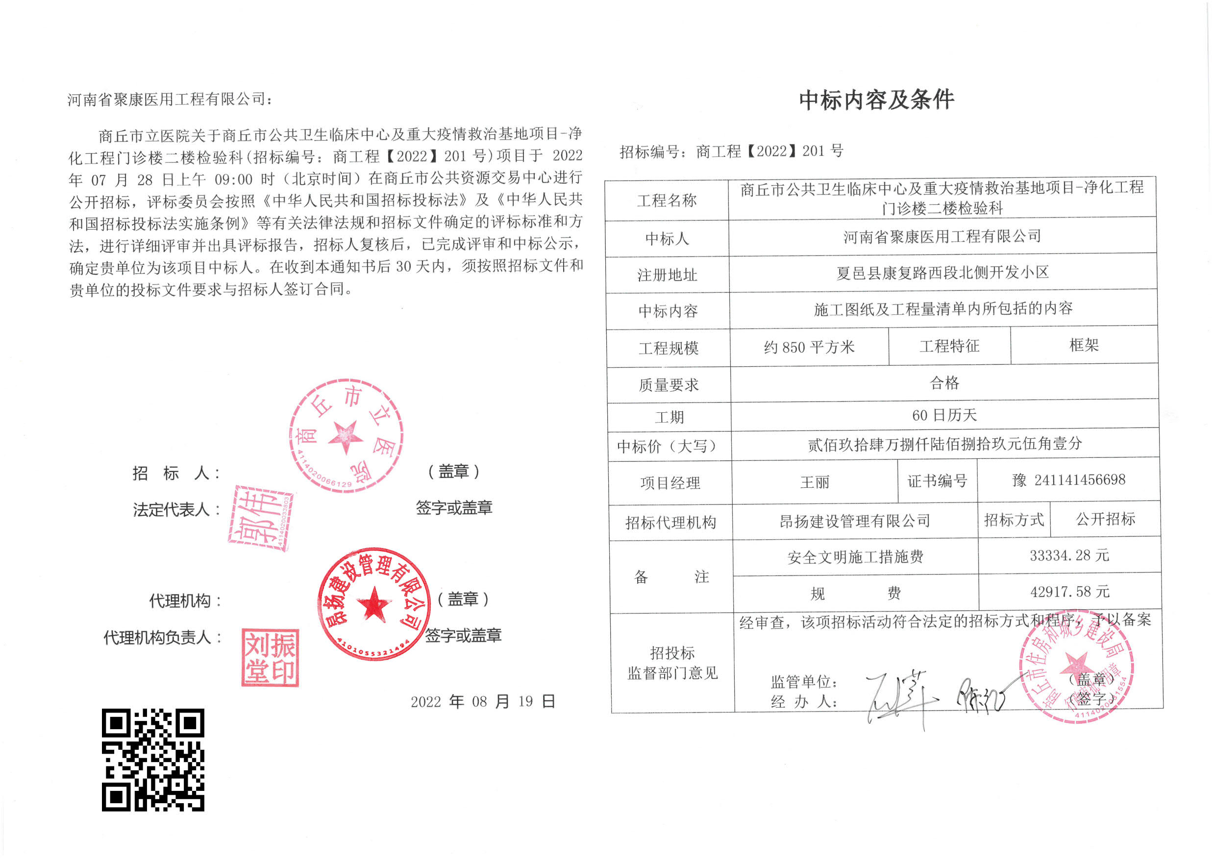 热烈祝贺我司在商丘市公共卫生临床中心及重大疫情救治基地项目-净化工程门诊楼二楼检验科投标活动中标